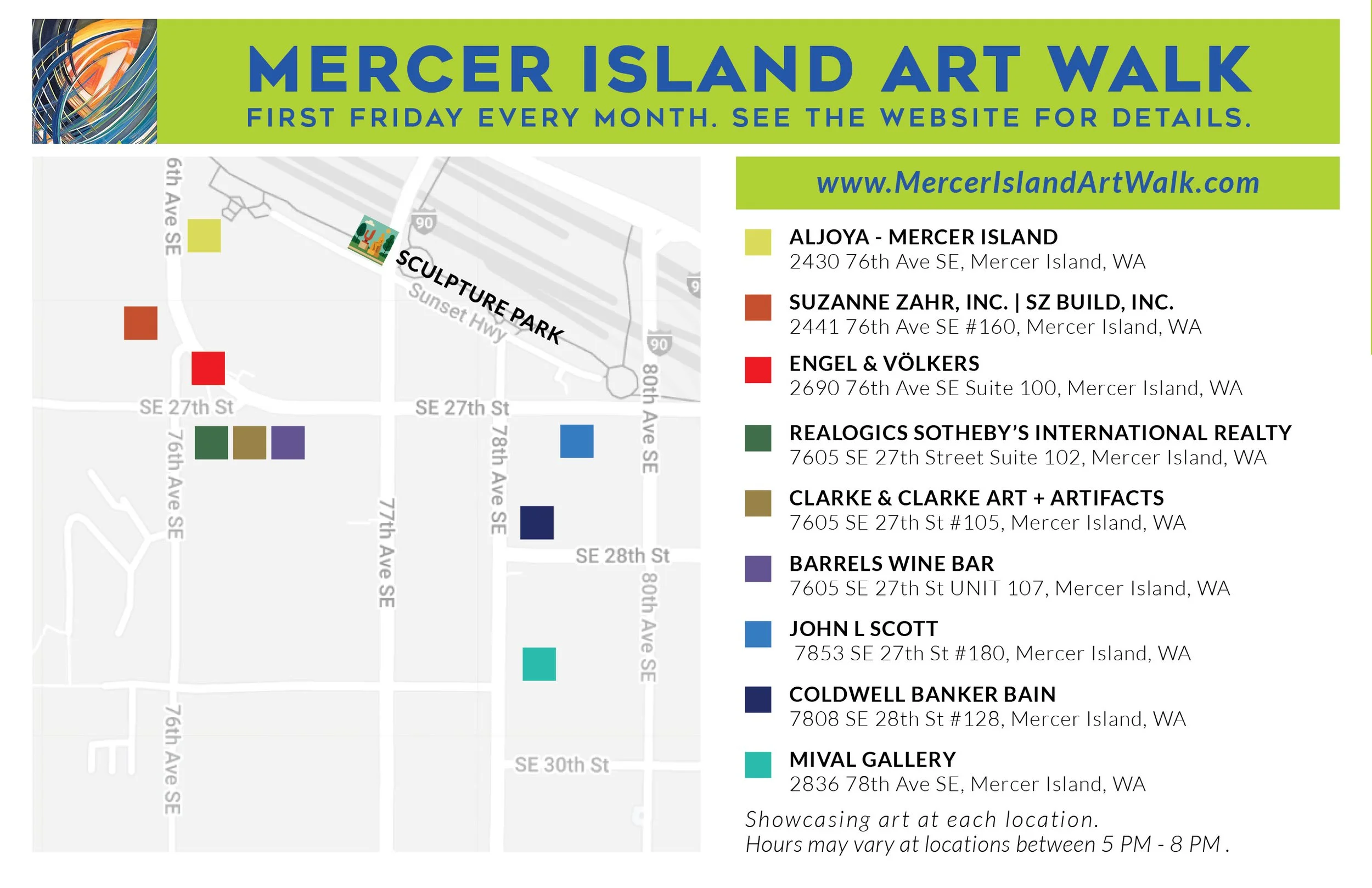 Participating Venues Aljoya Mercer Island Suzanne Zahr, Inc. Realogics Sotheby’s International Realty Clarke & Clarke Art + Artifacts Barrels Wine Bar John L Scott Coldwell Banker Bain MIVAL Gallery Engel & Völkers